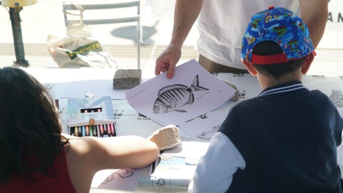 La giornata si apre con la condivisione dei dati del Rapporto NETTAG+, restituiti ai pescatori in modo poetico attraverso le cartoline illustrate da Alessandra Zaffiro, per poi lasciare spazio alla performance teatrale di Donatella La Macchia. Con il suo “U Cuntu” dedicato al mito di Colapesce, l’attrice fa dialogare la leggenda con la modernità del murale appena presentato, in un continuum tra passato, presente e futuro.