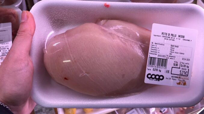 Milano – Oltre il 90% dei petti di pollo analizzati a marchio CONAD, Coop ed Esselunga presentano segni evidenti di white striping, una malattia che si presenta sotto forma di strisce bianche, costituite da grasso e tessuto cicatriziale, sui petti di pollo e che è indice di scarsa qualità della carne e condizioni di allevamento assolutamente inadeguate.
