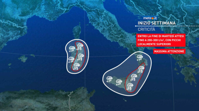 Sui mari di ponente e sul mar Ionio si intensificano gradualmente i venti di Scirocco: sta per aprirsi una settimana molto complessa e difficile per l’Italia meridionale, a causa dell’avvicinamento da ovest di una pericolosa perturbazione atlantica (la numero 7 del mese), responsabile di una fase di maltempo estremo, segnata da probabili gravi e pesanti criticità a causa delle piogge in qualche caso torrenziali (attese cumulate di pioggia tra i 200 e i 400 mm entro la fine di martedì), dei venti di tempesta (con raffiche al suolo fino a 120-130 Km/h), dei mari grossi o molto grossi (con onde fino a 6-7 metri fino alle coste) e delle conseguenti violente mareggiate.