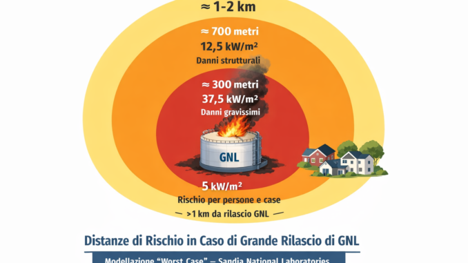 Questi dati non sono allarmistici, ma derivano da modelli fisico-chimici consolidati e sono usati anche per definire i criteri di pianificazione territoriale e di protezione civile nei paesi più avanzati. Anche nel caso di esplosioni di nube di gas, scenario meno probabile ma possibile, le distanze a cui si possono registrare danni strutturali o ferite lievi si estendono su centinaia di metri, con possibilità di effetti più ampi in condizioni sinergiche sfavorevoli.