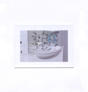 Accanto a questi elementi, lo specchio e il lavandino – reali o fotografici – diventano allegorie della cura di sé e dell’ossessione per l’immagine. Le ciglia finte applicate su superfici riflettenti evocano le particelle di polvere e di pelle che ognuno lascia nell’ambiente, tracce del nostro passaggio e della nostra presenza nello spazio.