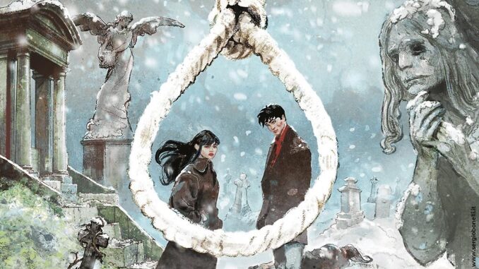 Romanticamente gotica, la copertina di Emiliano Tanzillo si rivela un prologo visivo all’orrore interno dell’albo: un teatro di statue pietrificate si staglia sulle lapidi del cimitero, sotto un cielo che rifrange la neve di macchie cremisi. Il bianco, così puro, s’insinua di rosso — un simbolo di sangue versato, passione tradita o colpa incancellabile. Dylan e Abby sono sospesi in primo piano, avvolti dal cappio, figura ossimorica che unisce apparente romanticismo e condanna inevitabile. La tomba di Abby, che occupa uno spazio osservazionale, getta un’ombra di fatalità, mentre il volto pensoso di un angelo — forse protettore, forse accusatore — contempla la scena con occhi silenziosi.