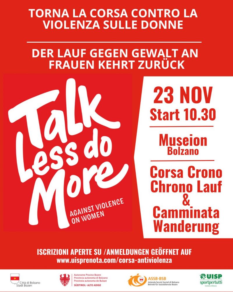 Sempre il 23 novembre a Bolzano si terrà la 12^ Corsa cittadina per dire no alla violenza sulle donne, organizzata da Uisp Bolzano. La partenza è prevista alle 10.30 dai prati del Talvera.