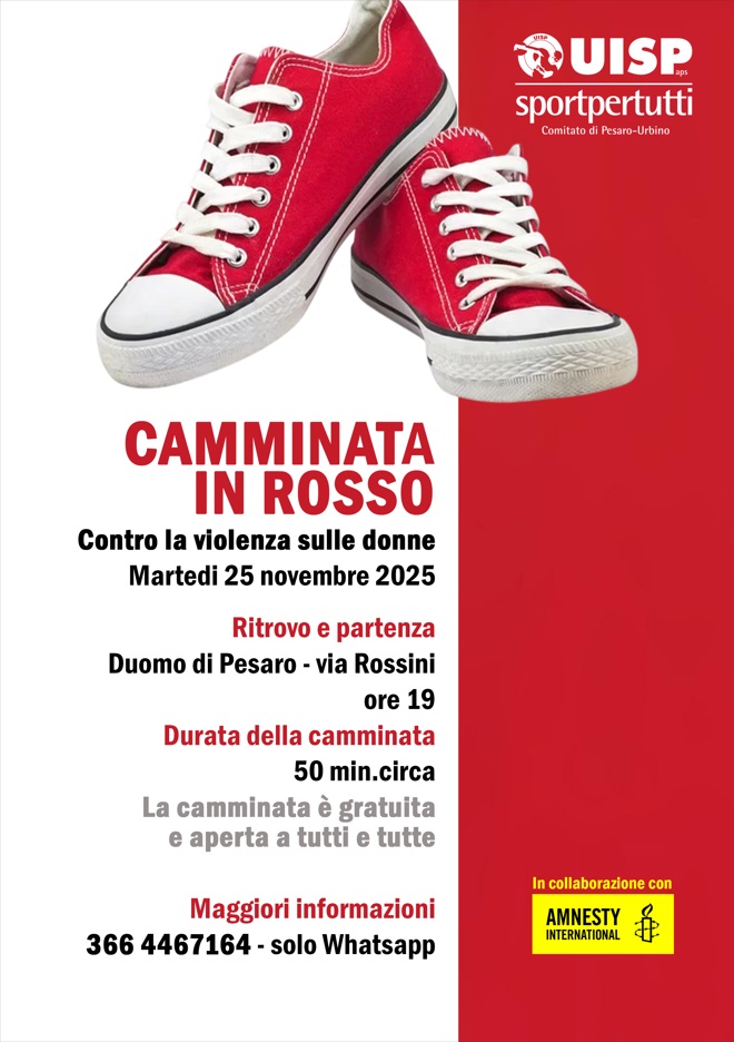 Martedì 25 novembre la città di Pesaro si tingerà di rosso per la Camminata in rosso, un evento promosso da Uisp Pesaro-Urbino in collaborazione con Amnesty International. La partenza è fissata alle 19 dal Duomo di Pesaro, in via Rossini, per una camminata della durata di circa 50 minuti. L’iniziativa è gratuita e aperta a tutti e tutte, è un invito rivolto alla cittadinanza a partecipare per dire insieme “no” alla violenza sulle donne e “sì” a una società più giusta e rispettosa. Tutti e tutte sono invitati a partecipare indossando un simbolo rosso – una maglia, una sciarpa o un paio di scarpe – per colorare le strade di Pesaro con il segno della solidarietà.