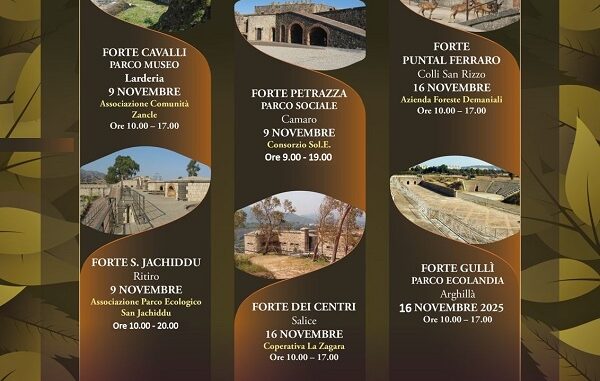 Messina – Domenica 9 e domenica 16 novembre si svolgerà a Messina la seconda edizione della kermesse “Forti d’Autunno”, promossa dall’Amministrazione comunale, in collaborazione con il Centro Studi MEDFORT, l’Azienda Foreste Demaniali di Messina, custode del Forte Puntal Ferraro, e le Associazioni referenti dei Forti Petrazza, Cavalli, San Jachiddu, Serra la Croce e Monte dei Centri.