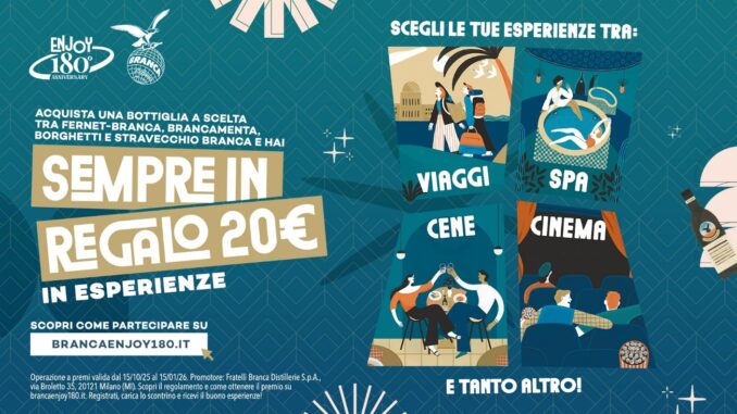 Da sempre sinonimo di freschezza,  convivialità e sensualità, Brancamenta oggi invita a vivere nuove esperienze in occasione dei 180 anni di Fratelli Branca Distillerie, il liquore diventa protagonista dell’iniziativa Branca Enjoy 180°, un concorso pensato per premiare chi sceglie qualità e autenticità. Dal 26 settembre 2025 al 15 gennaio 2026, acquistando una bottiglia da 70 cl di Brancamenta, così come di Fernet-Branca, Borghetti o Stravecchio Branca, ogni partecipante riceve un voucher esperienziale dal valore di 20 euro, utilizzabile per attività legate a viaggi, benessere, tempo libero e relax. Partecipare è semplice: basta registrarsi sulla piattaforma dedicata, caricare lo scontrino e ricevere subito il premio, con la possibilità di cumulare i crediti per accedere a esperienze sempre più ricche e personalizzate.