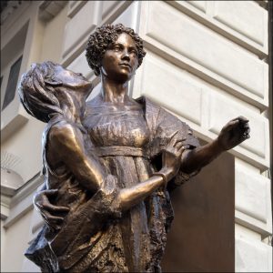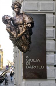 | Realizzato da Gabriele Garbolino Rù con la curatela artistica di Enrico Zanellati, il monumento è una scultura in bronzo in cui sono raffigurate due donne, Giulia di Barolo e una carcerata che lei tiene tra le braccia. L’autore dell’opera, docente dell’Accademia Albertina di Belle Arti di Torino – ha potuto studiare i ritratti custoditi a Palazzo Barolo, lasciandosi inoltre guidare dalle “Memorie sulle carceri” scritte in prima persona dalla marchesa e realizzando una reinterpretazione contemporanea della sua figura, in dialogo con la maestosa facciata del Palazzo che sostiene la scultura. Giulia di Barolo (1786-1864) fu instancabile nel suo servizio alle detenute e, insieme al marito Carlo Tancredi, fondò il Distretto Sociale Barolo, come primo luogo di accoglienza per le donne uscite dal carcere, e tante altre realtà di servizio sociale ed educativo, che l’Opera Barolo ha tutt’oggi il compito mantenere vive. Venerabili dal 2015 lei e dal 2018 lui, per Giulia e Carlo Tancredi è in atto il processo di beatificazione. |