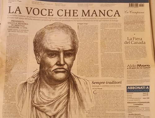 Manca un pensatore autorevole che incarni i valori civili di un popolo, le esigenze politiche, le aspirazioni letterarie. Ci vorrebbe un nuovo Cicerone, lo scriveva il direttore de Il Domenicale, Angelo Crespi, il 10 maggio del 2003. E invece nell’epoca del nulla televisivo vivacchiano gl’intellettuali postmoderni che hanno immolato la verità agli interessi di bottega. Pertanto, in Italia manca un Cicerone.