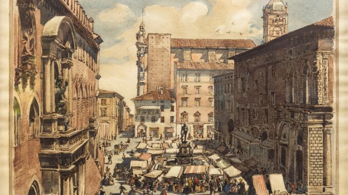La mostra monografica intende ripercorrere la tradizione del disegno e della grafica bolognese a cavallo tra Ottocento e Novecento, seguendo le tracce dell’intensa e poliedrica produzione di Pietro Pietra: un artista sognatore che ha profondamente amato Bologna, ritraendola in suggestive vedute e immortalando nei suoi lavori i luoghi simbolo della città — le storiche vie porticate, le antiche porte della cinta muraria, le piazze più caratteristiche. Qui il gusto per la veduta architettonica e il rigore prospettico si fondono con la teatralità scenografica e la dimensione narrativa, mentre le persone, ridotte a macchie o tratti essenziali, vengono spesso impiegate per misurare e animare la monumentalità urbana. Pietra rappresenta una Bologna ormai scomparsa, trasformata dai restauri e dalle demolizioni di fine Ottocento, recuperandone la memoria attraverso le sue vedute ad acquerello, tra realtà storica e visione onirica.