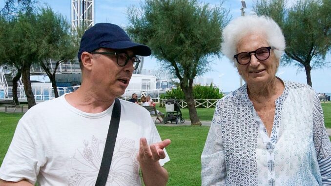Nella foto, Liliana Segre con Roberto Malini, co-autore della videoinstallazione Binario 21