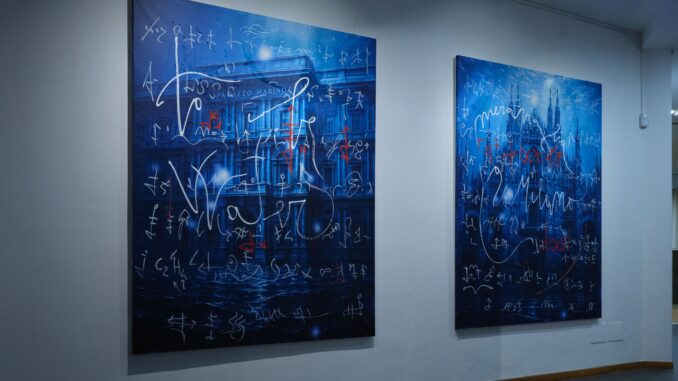 Al centro dell’esposizione, otto grandi tele di Marco Nereo Rotelli raffigurano luoghi simbolici della città – dalla Stazione Centrale al Duomo, dal Castello Sforzesco a CityLife fino allo stesso Acquario Civico – completamente immersi sott’acqua, tra elementi naturali e oggetti di consumo come bottiglie, scarpe, barattoli. Sulla superficie pittorica si intrecciano versi poetici e scritture luminose, cifra distintiva dell’artista.