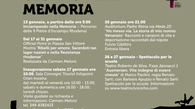 Rho – L’Amministrazione comunale di Rho organizza un intenso programma di eventi per celebrare, come ogni anno, il Giorno della Memoria che cade il 27 gennaio, data in cui nel 1945 fu liberato il campo di sterminio di Aushwitz, emblema dello sterminio di milioni di persone, tra cui ebrei, Rom e Sinti, oppositori politici al regime nazista, persone con disabilità e omosessuali.