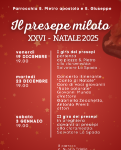 Messina – Venerdì 19 dicembre 2025 con inizio alle 19 dalla piazza S. Pietro si terrà a Mili S. Pietro il primo caratteristico “Giro dei presepi”. L’iniziativa del Centro Turistico Giovanile di Mili, che quest’anno ha celebrato i cinquant’anni di attività, e della Parrocchia di Mili S. Pietro rientra nell’ambito della manifestazione “Il presepe miloto”, giunta quest’anno alla XXVI edizione. Una quarantina sono i presepi costruiti dalle famiglie del villaggio negli angoli più caratteristici e tra le viuzze di impronta medievale del borgo di Mili San Pietro, che già in questi giorni hanno attirato l’attenzione e l’ammirazione di numerosi visitatori.