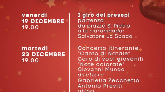 Il programma dell’iniziativa prevede, fra le altre iniziative, martedì 23 dicembre con inizio alle 19 dalla piazza del villaggio il Concerto itinerante per le vie del borgo del Coro di voci giovanili “Note colorate” diretto da maestro Giovanni Mundo con la partecipazione degli attori Gabriella Zecchetto e Antonio Previti e infine, sabato 3 gennaio, sempre con inizio alle 19 da piazza S. Pietro, il secondo “Giro dei presepi” guidato dal parroco, don Nunzio Triglia e accompagnato dalla ciaramedda del maestro Salvatore La Spada.