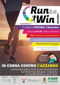 Domenica 2 novembre a Ravenna si terrà la Run to Win, la camminata o corsa ludico motoria organizzata da Uisp Ravenna – Lugo con il coordinamento delle società podistiche di Ravenna e lo Sportello ESC per giocatori d’azzardo patologici e familiari. Partecipa anche l’Ausl Romagna.