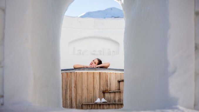 E tutto questo nasce da un’idea semplice e visionaria. In inverno, quando Livigno scende sotto zero e le notti toccano anche i –30 gradi, la famiglia Giacomelli dell’Hotel Lac Salin ha guardato la neve non come limite, ma come materia viva. Così è nata una SPA temporanea fatta di ciò che la montagna offre: ghiaccio e neve. L’artista livignasca Vania Cusini, maestra delle sculture effimere, ha trasformato per il terzo anno consecutivo questo sogno in realtà, creando una struttura candida abbinata ad una vasca idromassaggio.
