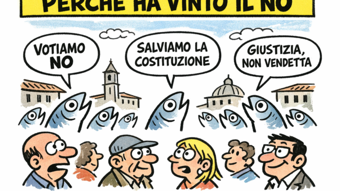 Non è un caso che proprio tra gli under 34 il No abbia superato il 60%, mentre il consenso al Sì si è concentrato nelle fasce più anziane e nei centri più piccoli. È una geografia che racconta qualcosa di più di una semplice scelta elettorale. Racconta una partecipazione. In questo senso, il risultato richiama alla memoria la nascita del movimento delle Sardine. Anche allora si cercò di ricondurre tutto a una logica di schieramento, di etichetta politica. Ma ciò che rendeva quel movimento diverso era proprio la sua natura, perché si trattava di una vera e propria mobilitazione dal basso, non orchestrata da partiti o media, ma alimentata da cittadini. Qualcosa di simile è accaduto oggi.