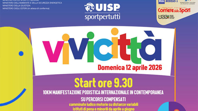 Vivicittà, manifestazione podistica a circuiti compensati con classifica unica nazionale è organizzata dall’Uisp-Unione Italiana Sport Per tutti, con il patrocinio del Ministero per lo Sport e i Giovani, del Ministero della Giustizia, del Ministero dell’Ambiente e della sicurezza energetica, del Ministero degli Esteri (in attesa di conferma). Vivicittà gode della collaborazione della Fidal-Federazione Italiana di Atletica Leggera, dell’Ussi-Unione Stampa Sportiva Italiana e della Nazionale delle Giornaliste e Giornalisti asd. Partner della manifestazione è Marsh, broker assicurativo, e media partner sono Radio 1 Rai e Corriere dello Sport.