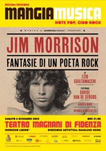 FIDENZA (Parma) – La quarta e ultima serata del decennale di Mangiamusica – Note pop, cibo rock, rassegna ideata e diretta dal giornalista Gianluigi Negri, ha per protagonisti quattro artisti che ormai sono di casa al Teatro Magnani di Fidenza. Si tratta di Davide Van De Sfroos, Andrea Mirò, Ezio Guaitamacchi e Brunella Boschetti, i quali sabato 6 dicembre porteranno in scena (inizio alle 21, ingresso gratuito) lo spettacolo “Jim Morrison – Fantasie di un poeta rock”, nel sessantesimo anniversario della nascita dei Doors.